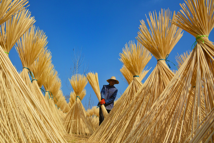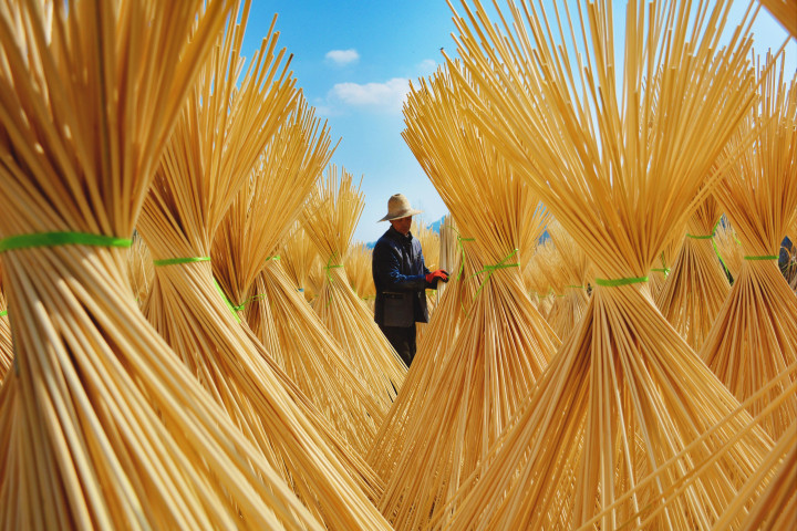 ↑2025年2月27日,在安徽省安庆市岳西县一家竹制品加工企业,工人在晾晒毛竹半成品。CICPHOTO/吴均奇 摄