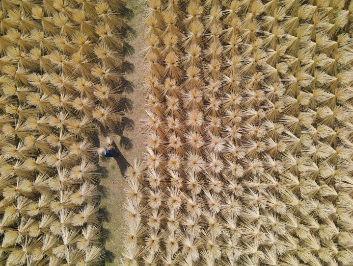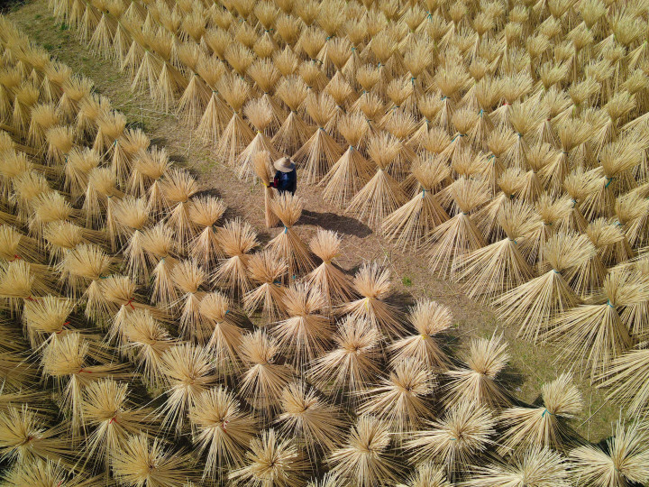 ↑2025年2月27日,在安徽省安庆市岳西县一家竹制品加工企业,工人在晾晒毛竹半成品。(无人机照片)CICPHOTO/吴均奇 摄